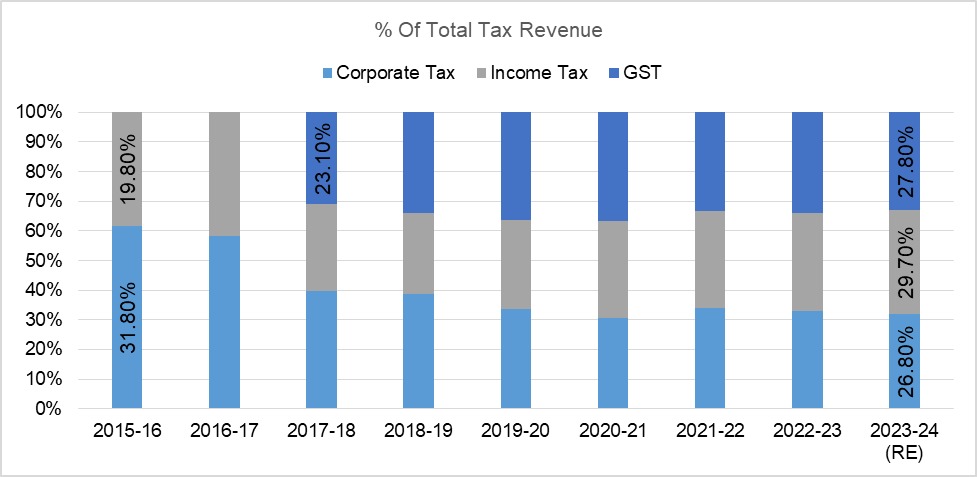 Particularly concerning are the disparities in taxation between corporates and individual income taxpayers, and the increasing percentage of GST receipts in total tax revenue, indicating that even those not within the tax slabs are ultimately taxed at a higher rate. The share of total tax revenue receipts from corporates was around 31% in FY 2015-16 but has significantly declined to 26% in 2023-24. This reduction led to a government loss of about Rs 1 lakh crore in FY 2020-21, which was offset by taxing the people. Consequently, receipts from income tax have surged from 19.8% to 30%.