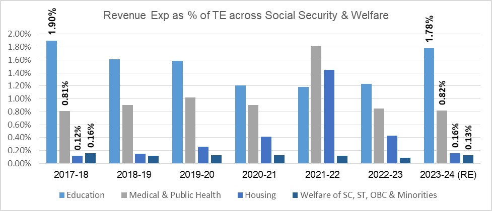 However, a closer look at the figures in terms of percentage of total expenditure reveals a different story. For example, spending on education was just around 1.9% in FY 2017-18, which has fallen to 1.7% in 2023-24. Medical and public health expenditure has decreased from 0.8% to 0.16%, and welfare for Scheduled Castes, Scheduled Tribes, and minorities has declined from 0.16% to 0.13%. Despite overall growth in expenditure, the proportion allocated to these critical sectors has either decreased or remained stagnant, highlighting a gap between intent and impact.