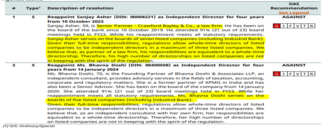 Institutional Investor Advisory’s Services (IiAS) Recommendations on IndusInd Bank’s Resolutions. Source: IiAS