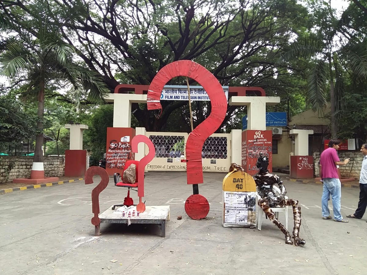 July 21, 2015: Day 40 of the strike. The installation at the gate, with an executive chair on which is placed a large rock, alongside a milestone indicating the day, beside which sits a ‘sentry; made up of celluloid film stripe. Towering over it all is the gigantic question mark. Five days later, an ABVP group destroyed this installation, but it was up again the following day. Courtesy the publisher.
