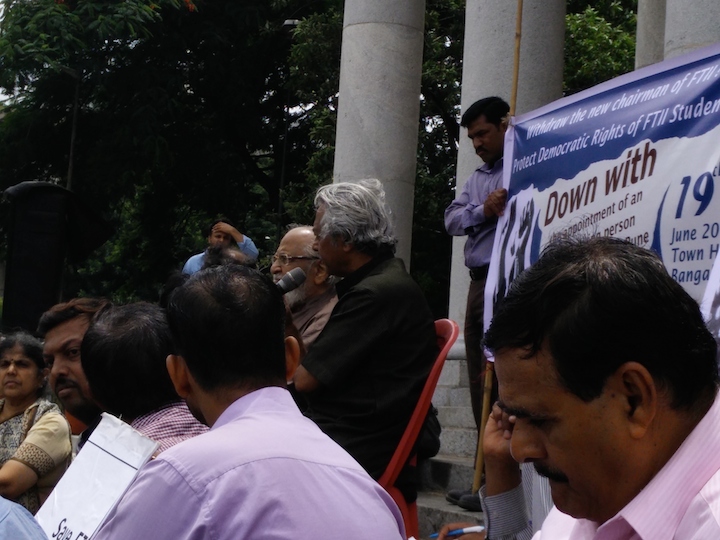 June 19, 2015: filmmakers protest at the Town Hall, Bangalore, in solidarity with FTII students. Girish Kasaravalli speaking. Courtesy the publisher.