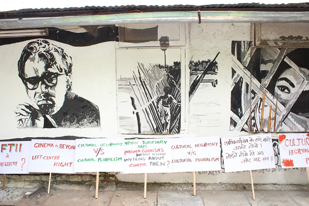 Alongside the wall of the main theatre, FTII, protest placards in front of the iconic drawings of Ritwik Ghatak and images from his films. Courtesy the publisher.