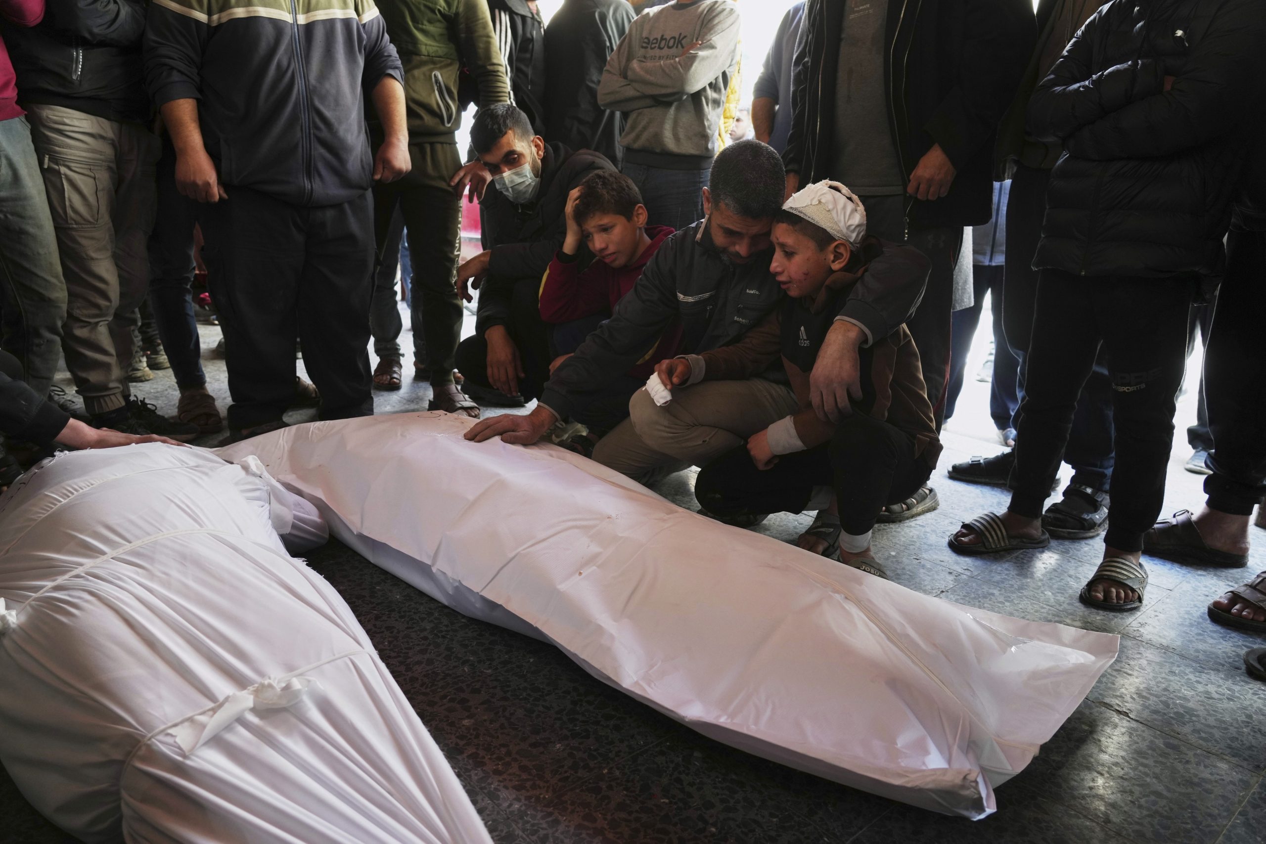 Palestinians mourn over the bodies of Al-Mashharawi family members, who were killed in an Israeli airstrike that hit their home, at Al-Ahli Hospital in Gaza City on Saturday, March 22, 2025. Photo: AP/PTI
