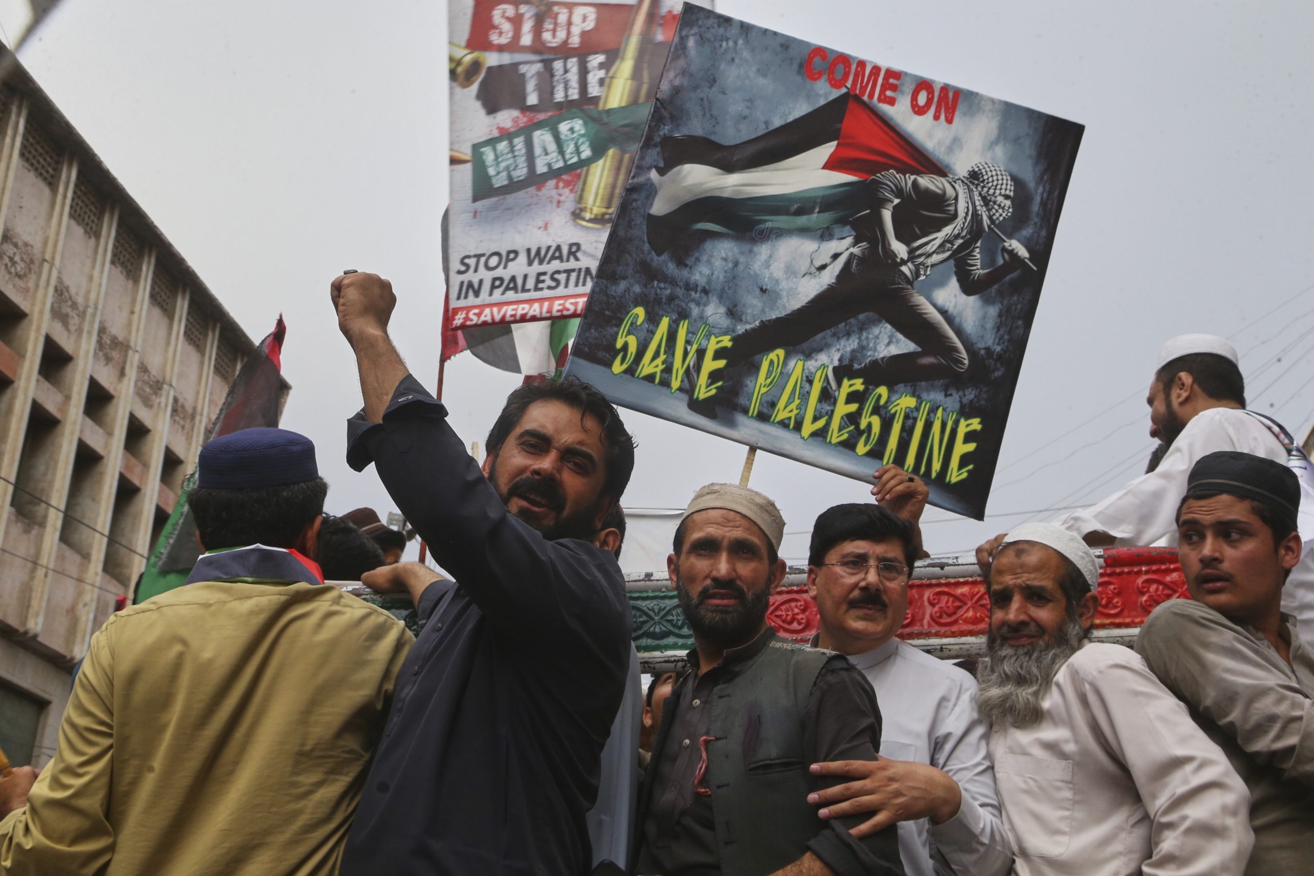Traders hold a demonstration against Israeli airstrikes and to show solidarity with Palestinian people living in Gaza, in Peshawar, Pakistan Friday, April 18, 2025. Photo: AP/PTI