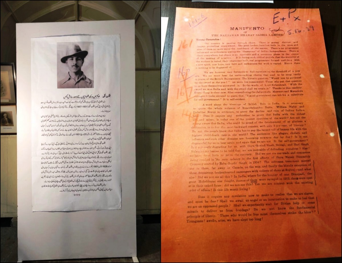 (L) Exhibition by Punjab Archives Lahore on Bhagat Singh files in 2018 (R) Front page of Naujwan Bharat Sabha manifesto from Bhagat Singh files in Punjab Archives Lahore exhibition 2018. Photo: Nusrat Manto