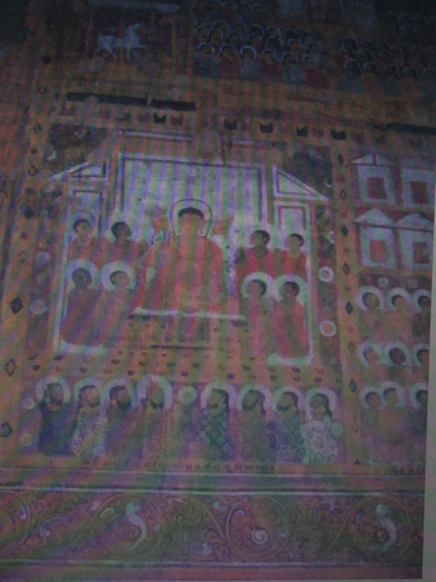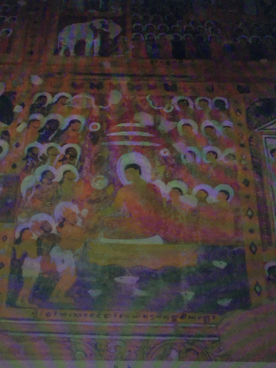 Rajakumar in fact mastered the full range of Theravada literature, cosmology, and history, and put his knowledge spectacularly on display in his temple. His intent, as far as I could tell, was to use paint and accompanying explanatory gloss to provide the worldview of the textual tradition to Buddhists of his time. Rajakumar also does what many scholars do: he engages with the text, dropping the bits that do not interest him and adding others that make the story more personal. He brings the story of Buddhism’s spread up to the time of the Anawrahta, whom his father had served as a general. The Sinhalese king –Vijayabahu, who died around time this temple was being built, is imaged here as well.