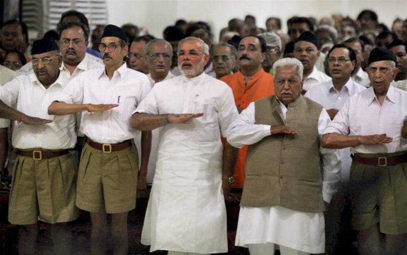 File photo from 2009 of Narendra Modi and BJP leader Keshubhai Patel giving the RSS salute. Credit: PTI