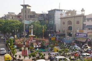Bhai Mati Das Museum at Chandni Chowk. The museum building is the façade with rooftop canopies on the right side. Photo: Author provided.