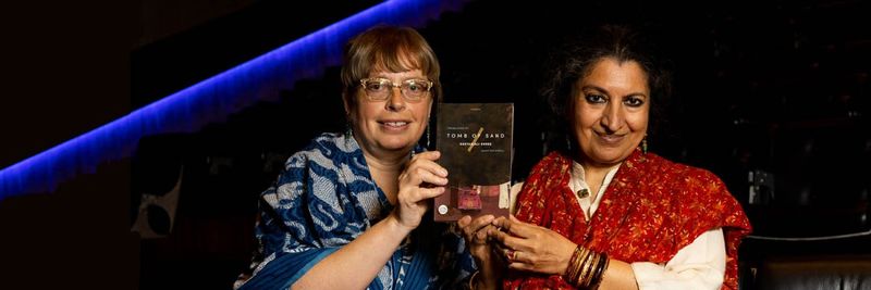 Daisy Rockwell (L) and Geetanjali Shree holding up a copy of 'Tomb of Sand'. Photo: Twitter/@TheBookerPrizes