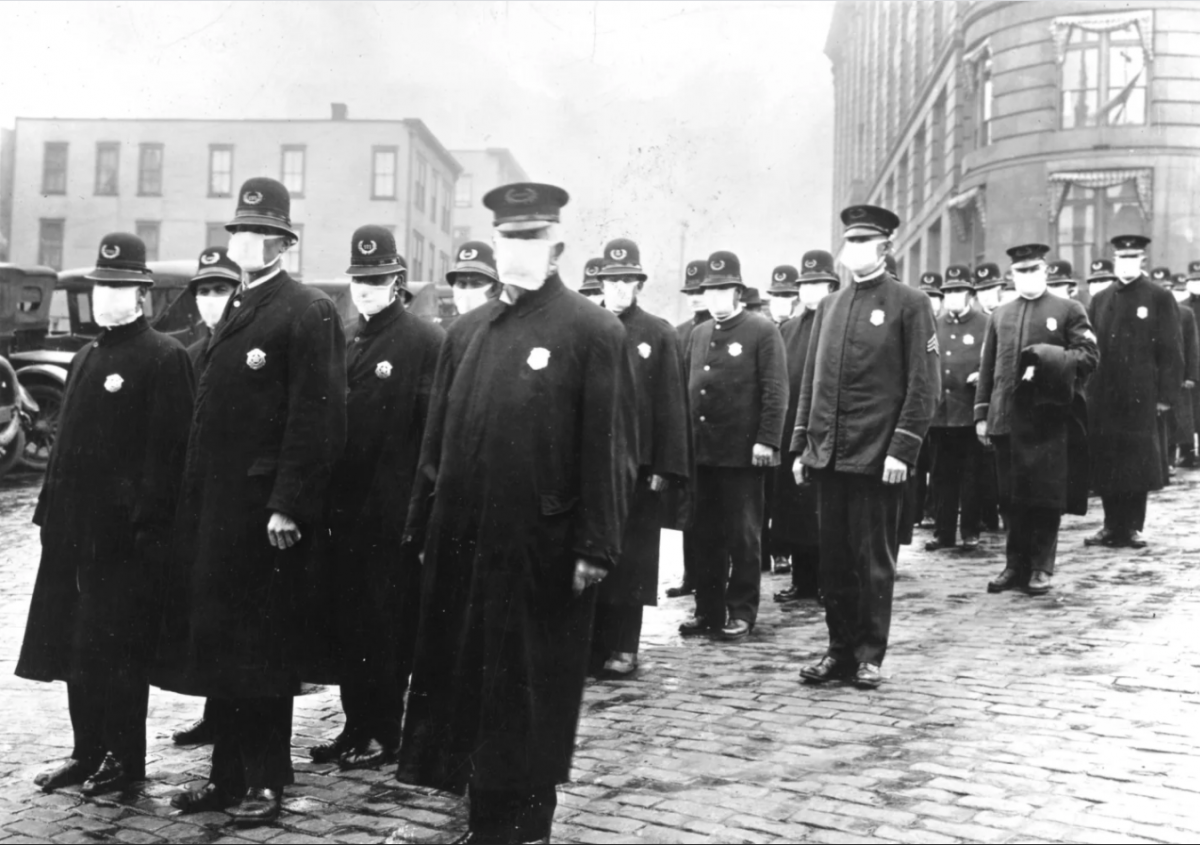 Policemen in Seattle wearing masks made by the Red Cross, during the influenza epidemic. December 1918. Photo: archives.gov