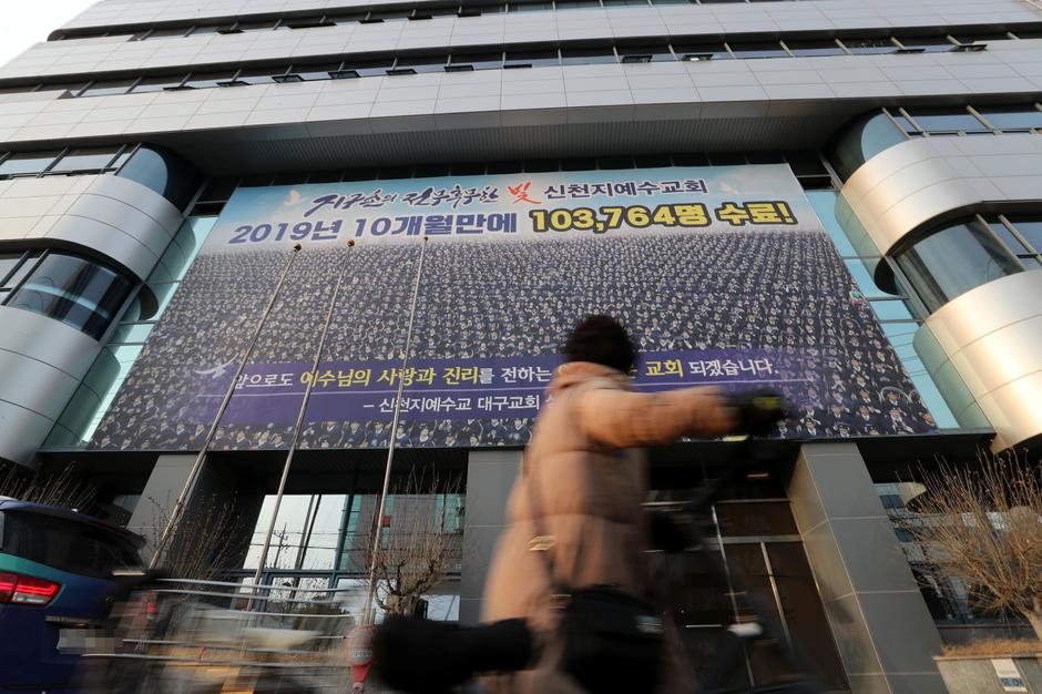 A woman walks past a branch of the Shincheonji Church of Jesus the Temple of the Tabernacle of the Testimony where a woman known as "Patient 31" attended a service in Daegu, South Korea, February 19, 2020. Photo: Yonhap via REUTERS