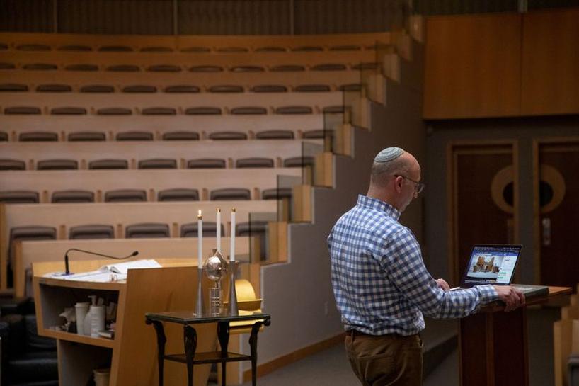Rabbi Michael Moskowitz answers questions during the final portion of a virtual Friday night Shabbat service where viewers can ask the rabbis questions about anything relating to Judaism inside Temple Shir Shalom, a Reform synagogue in West Bloomfield Township, Michigan, U.S. on March 27, 2020 amid a coronavirus disease (COVID-19) outbreak across the country. Photo: REUTERS/Emily Elconin
