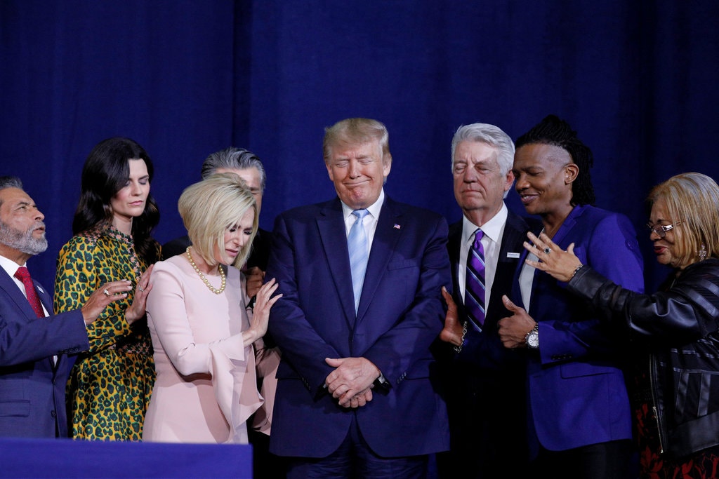 US President Donald Trump in a prayer before speaking at the Evangelicals for Trump kick-off rally in Miami in January 2020. Photo: Tom Brenner/Reuters