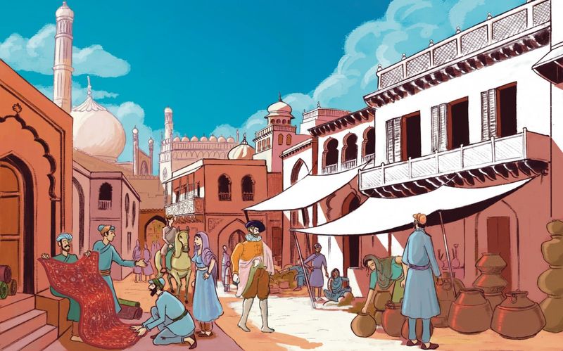 There are two-page spreads to break the passage of time – here focusing on what a day in the life of an emperor looked like, there on the marketplace, somewhere else on the women who were key players in the Mughal scheme of things, and so on.