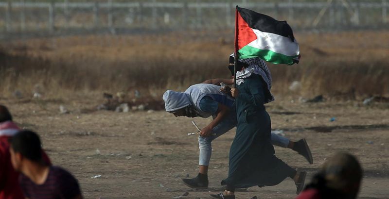 Palestinian demonstrators run for cover from Israeli fire and tear gas during a protest against the US embassy move to Jerusalem and ahead of the 70th anniversary of Nakba, at the Israel-Gaza border in the southern Gaza Strip, May 14, 2018. Credit: Reuters/Ibraheem Abu Mustafa