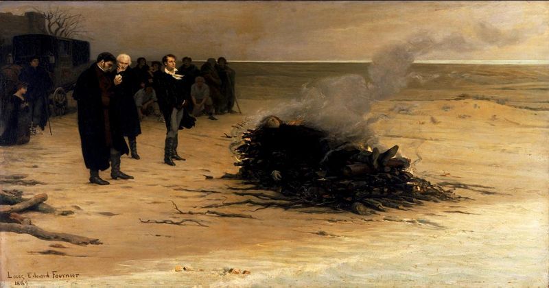 By 1889, the continued fascination around Shelley’s death meant that his cremation became the subject of a painting; Louis Édouard Fournier’s 'The Funeral of Shelley'. The painting depicts a remarkably preserved corpse on a pyre, surrounded by his friends, including Lord Byron (who in reality went swimming in the sea during his funeral) and Mary Shelley kneeling in the background (she did not attend the funeral at all).
