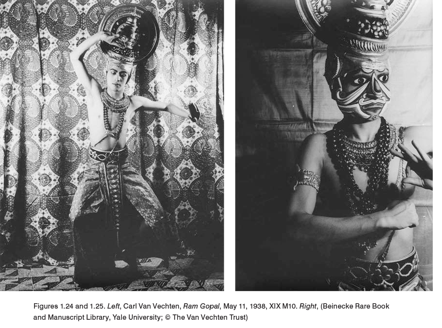 Sinha’s meticulous analysis of the pictures is exhaustive – the costumes, lighting, the fabric backdrops and he interprets these sessions as photo attractions, implying a homo-erotic interest on the part of Van Vechten. But this probably comes from his deep dive into Van Vechten and his role in the cultural moment. It is from researching Vechten’s biography that he learns of his homo-erotic tastes and fantasies, especially of black men from Harlem. The photographs themselves never seem to have been published or seen anywhere until this book. Most dance photography then was done professionally in studios, and these were likely not suitable for promotion purposes. Contrast the Baron studio photo from his autobiography made in London with his Javanese dancer partner Retna Mohini Cartier Bresson (yes, the wife of photographer Henri Cartier Bresson).
