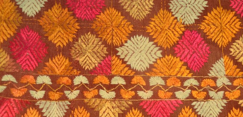 The sizzling, vibrant orange, ochre and pink satin-floss geometrics of Punjabi phulkari, once seen can never be forgotten.