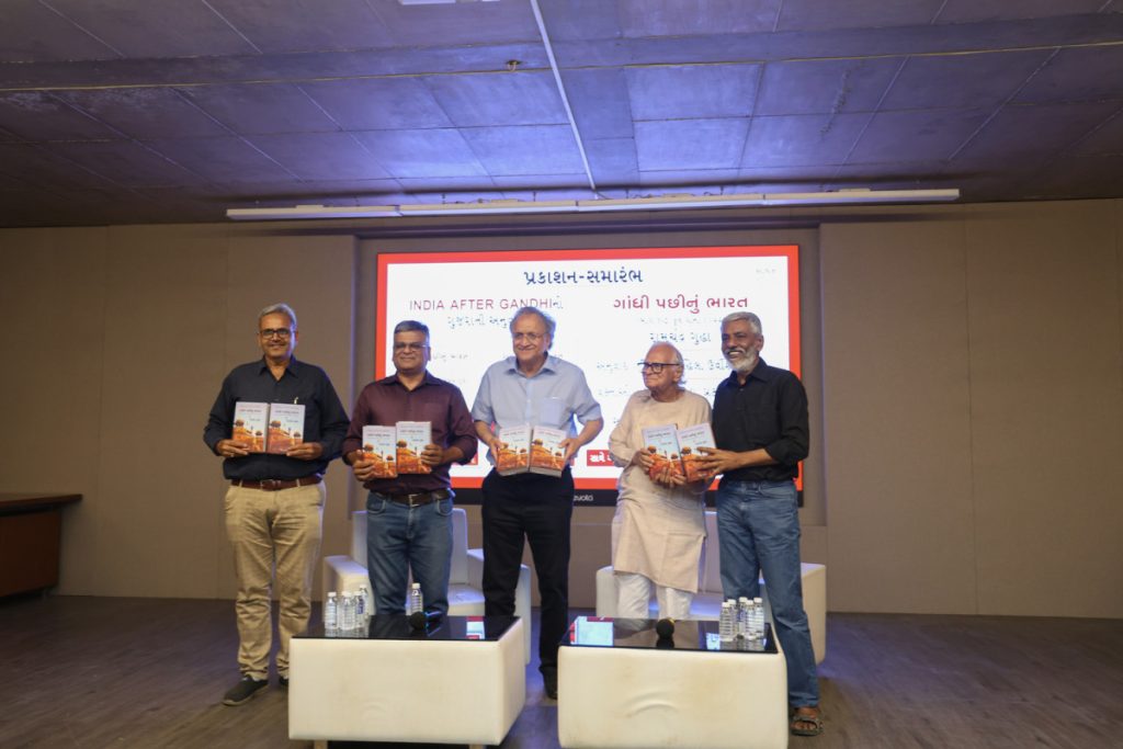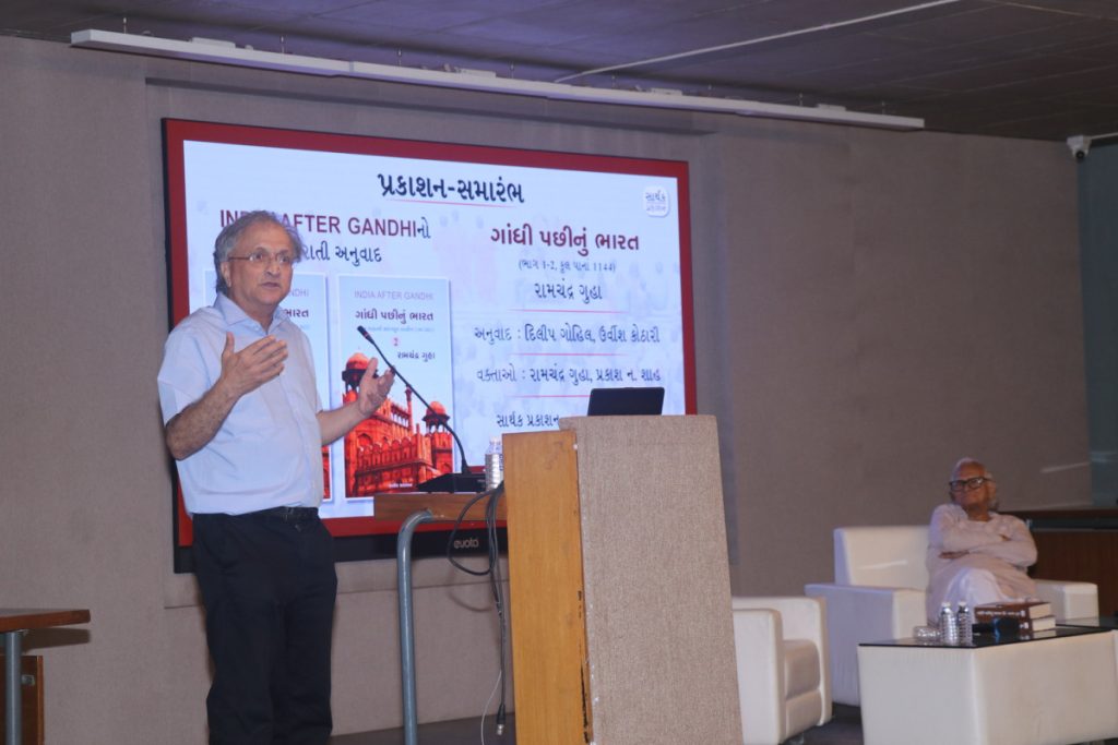 Guha has a limited acquaintance with Gujarati (he understands it if spoken slowly, he said). But he articulated two reasons why the Gujarati translation was special for him: M.K. Gandhi, of whom he is possibly the best-known biographer, wrote in the Gujarati language. And second, he met his wife (the influential designer Sujatha Keshavan) in Ahmedabad forty-something years ago.