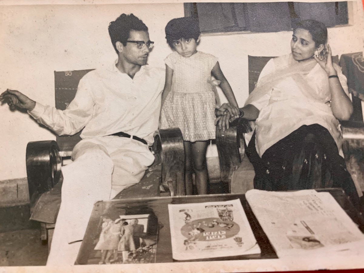 A black and white photo of mine with my parents holding hands sits on my father’s study table. I am four, and bright-eyed with a mop of short hair and bangs.