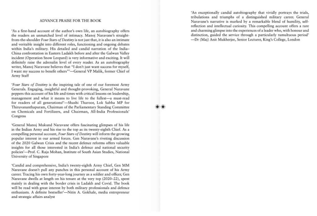 Before these hurdles from the government emerged, Four Stars of Destiny was poised to be the definitive military account of contemporary India from a top general. The book features glowing advance praise from defence journalist Nitin Gokhale, strategic expert C. Raja Mohan, former Army Chief General V.P. Malik, academic Anit Mukherjee and Congress MP Shashi Tharoor. As per practice, the blurbs are seen as endorsements provided after the manuscript of the book has been finalised and provided to the blurb writers.