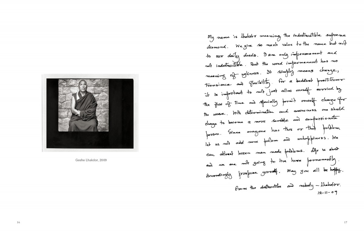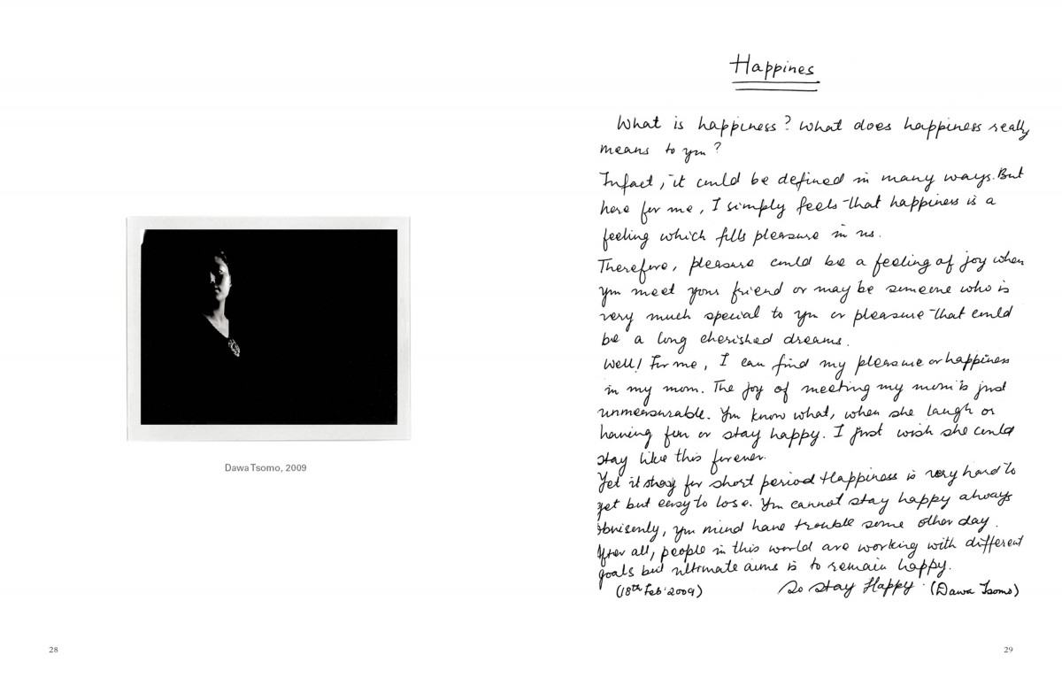 Chopra's book includes a few pages from the diaries of some of the individuals she photographed. These handwritten pages tell of the writers' struggles against the mammoth Chinese occupation of their country.