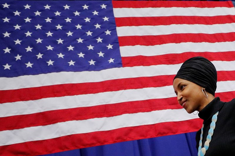 Rep. Ilhan Omar (D-MN) speaks about Trump administration policies toward Muslim immigrants and her own immigrant background at a news conference by members of the U.S. Congress "to announce legislation to repeal President Trump’s existing executive order blocking travel from majority Muslim countries" outside the U.S. Capitol in Washington, US, April 10, 2019. Credit: Reuters/Jim Bourg/Files