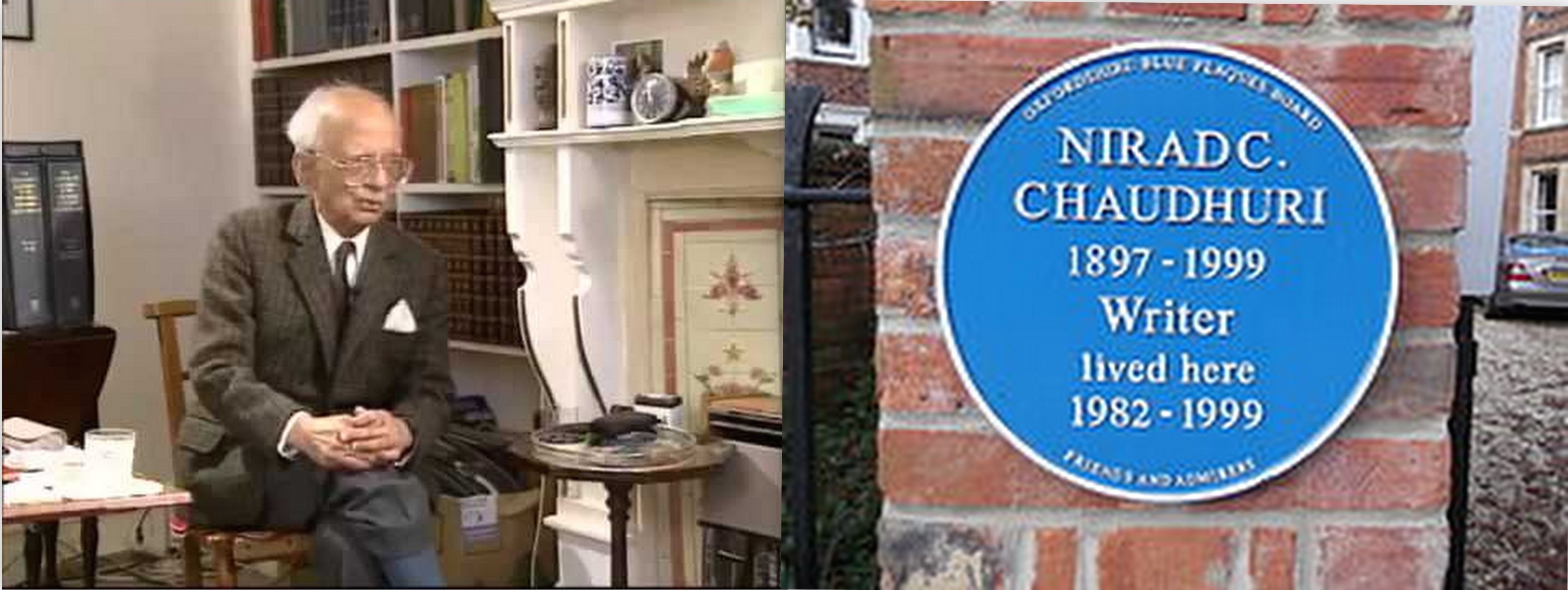Nirad C. Chaudhuri in his home in north Oxford, and the plaque outside his house, commemorating him after his death in 1999. Credit: Youtube, Wikipedia