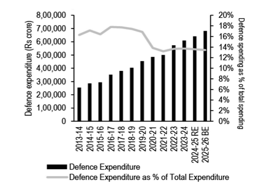 One, India’s defence budget is inadequate to cope with a two-front situation that exists vis-à-vis China and Pakistan, which have a track record of strategic collusion. Studies by PRS Legislative Research bring out the inconvenient fact that in recent years, the central government’s expenditure on defence has decreased as a share of its total expenditure – from 17.1 per cent in 2014–15 to 13 per cent in 2025–26 (BE). Can we afford this downward trend?