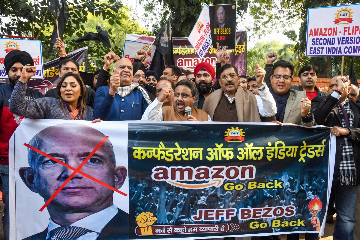 Then came the news of the antitrust probe into Amazon and Flipkart in January 2020, the same month Bezos was making another trip to India. Traders staged small street protests, holding up placards with a red "X" emblazoned on a picture of the Amazon CEO's face and the words, "Jeff Bezos Go Back!"