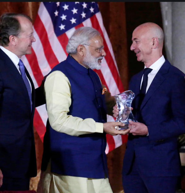 Even after India implemented new investment rules in 2016, relations between Bezos and the Modi government seemed good. That June, the Amazon boss received a business leadership award from Modi at a US-India Business Council event in Washington. Bezos told the audience how small sellers were benefitting from Amazon's India marketplace. He announced he planned to invest a further $3 billion in the country.