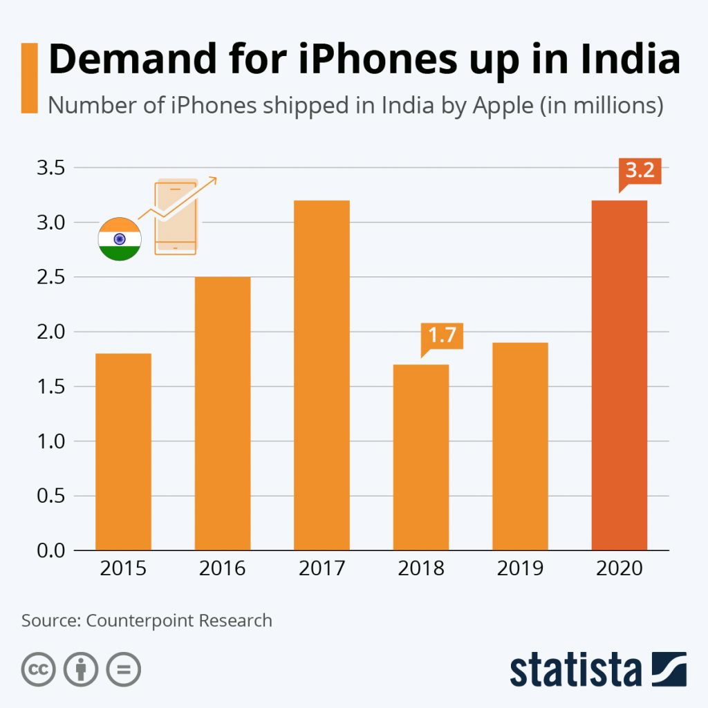 Apple made the 60% jump between 2019 and 2020 with the help of its first Indian online store opened last year. Physical stores are to follow, according to the company. Previously, Apple could not sell directly in India, but has gained that privilege by opening up its own production in the country in late 2019. The move also enabled Apple to circumvent India’s hefty import fees, making the iPhone more affordable.