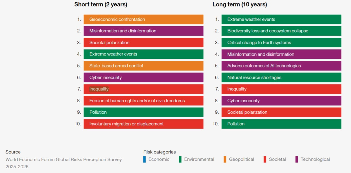 Inequality, interconnected with other risks and ranked seventh over two and ten years, exacerbates these divides as social mobility falters amid economic shocks and technological disruption.