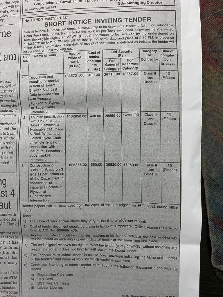 RTI replies from the Himanta administration reveal that while the mega inaugural ceremony was held on November 4, 2021, the Assam state authorities issued tenders in newspapers seeking bids from local contractors to carry out preparatory work for the flyover only five months later.