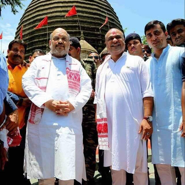 Union home minister Amit Shah and Assam chief minister Himanta Biswa Sarma seen with Bhaskar Sarma in Guwahati. Photo: Special arrangement