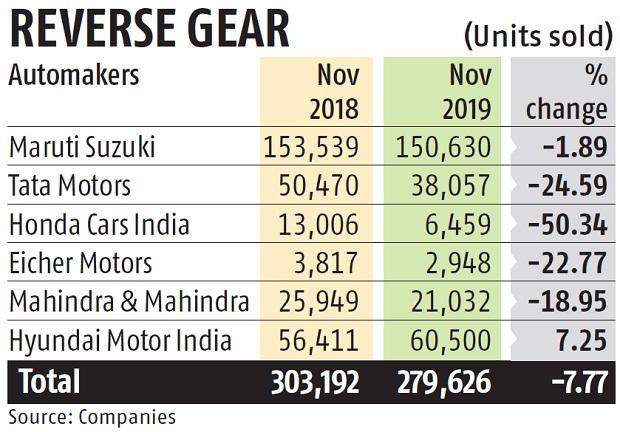 For instance, market leader Maruti Suzuki India (MSIL) reported sales of 150,630 passenger vehicles in the domestic market in November, down 1.9% over 153,539 units in the corresponding month last year.