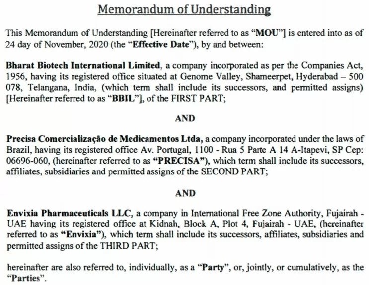 As per the document, released by Folha de Sao Paulo, the MoU proposes a future contract between three “parties”. While mails sent to Bharat Biotech and Precisa Medicamentos by The Wire remained unanswered, the executive director of the Brazilian firm, Emmanuela Medrades, confirmed to Folha de Sao Paulo that the Dubai company was “indeed” part of the document.