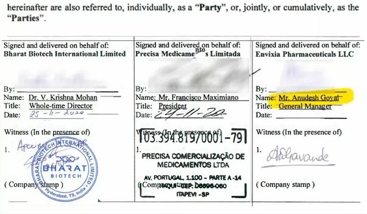 The details in the MoU also raise suspicions about Envixia's precise status. At the bottom of the document, there are three signatures. On behalf of Bharat Biotech, it is signed by Dr V. Krishna Mohan whose title is written as whole-time director; the witness signature appears to read “Apoorv Kumar”, who, as per other documents seen by The Wire, is a top executive of the company. In the middle column of the MoU, sits the signature of Francisco Maximiano, the president of Precisa Medicamentos. In the third column, the MoU is “signed and delivered on behalf of Envixia Pharmaceuticals LLC” by Anudesh Goyal whose title is written as general manager. Unlike the other two columns, there is no date and company stamp below Goyal’s name. The witness signature in this column appears to be “A Gavande”.