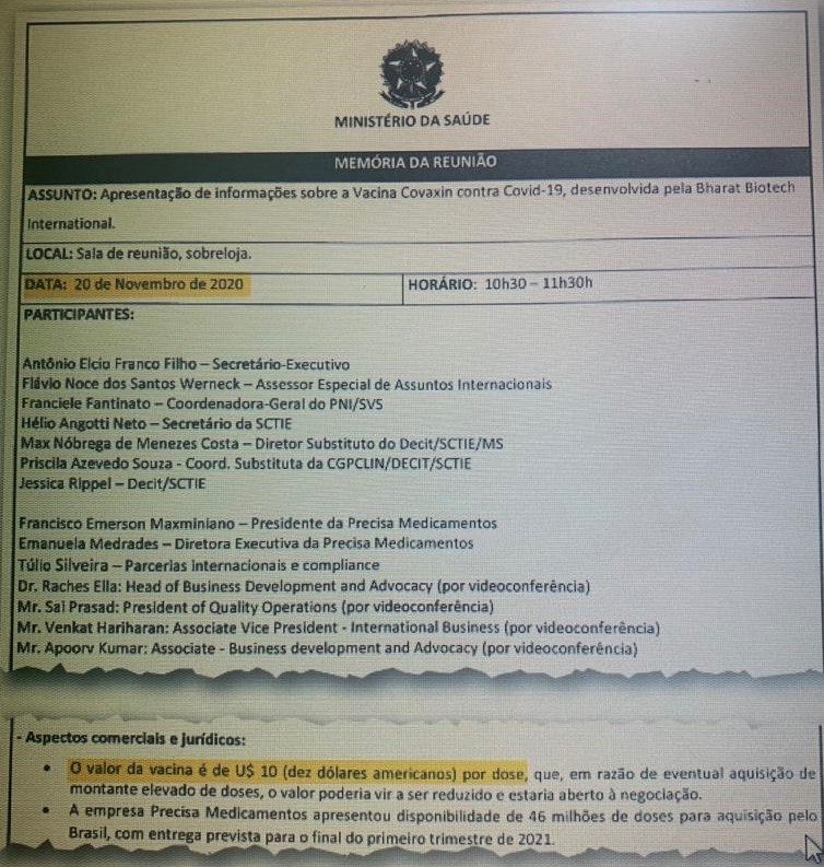 A Minutes of the Meeting document from the ministry of health shows the Indian company made an offer of $10 per dose in its first meeting with the Brazilian government in November 2020. Photo: Screenshot of TV Senado