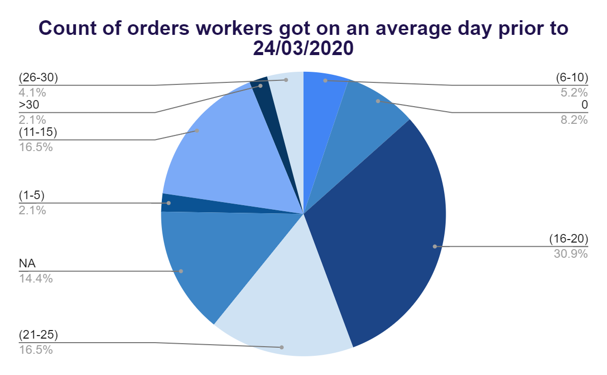 From our survey we found that prior to the lockdown, a substantial percentage of surveyed workers (30.9%) received 16-20 orders a day.