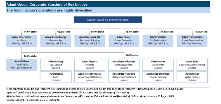 After the Reliance and Tata groups, the Adani Group is the third largest conglomerate in India based on a total market capitalisation of over $200 billion, as of August, 2022. Founded in 1988 as a commodity trading business by businessman Gautam Adani, the Group has expanded rapidly across key industry verticals such as energy, utilities and transportation. The Group has six established listed entities, namely Adani Enterprises (AEL), Adani Green Energy (AGEL), Adani Ports and Special Economic Zone (APSEZ), Adani Power, Adani Total Gas and Adani Transmission.