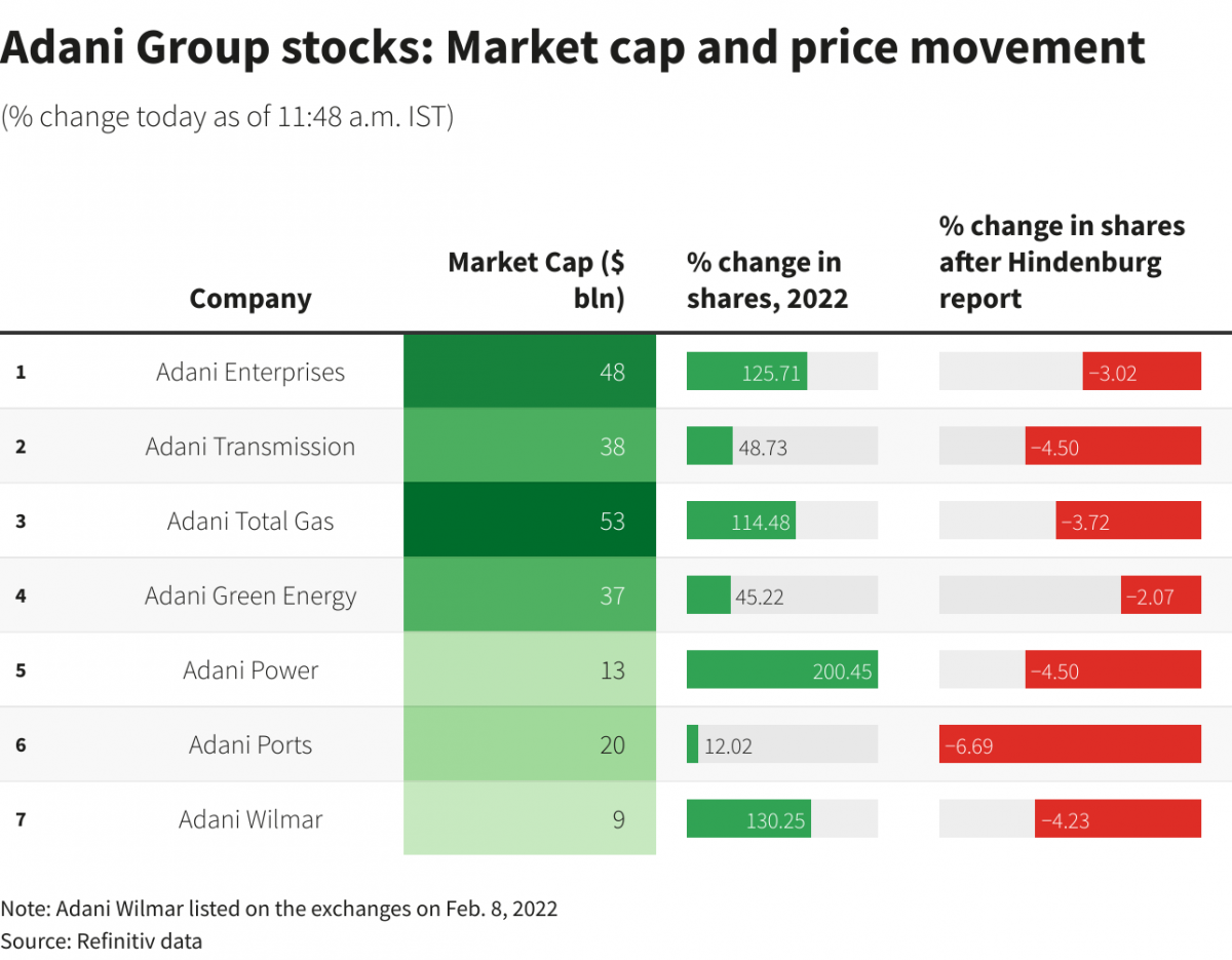 An Adani spokesperson did not immediately respond to Reuters request for comment on the report, which Hindenburg said was based on research that involved speaking with dozens of individuals, including former Adani Group executives as well as a review of documents.
