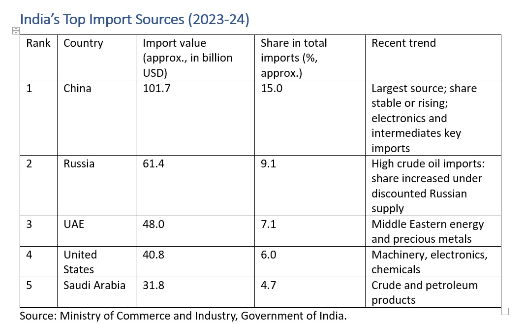 India has been trying hard to diversify its exports and imports beyond China and the dominance of a few partners. However, the continued large share of imported manufactured intermediates and consumer goods reveals a contradiction between trade realities and the aspirational goals of Atmanirbhar Bharat.