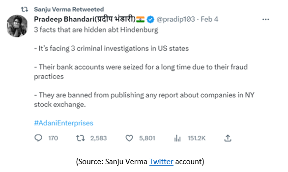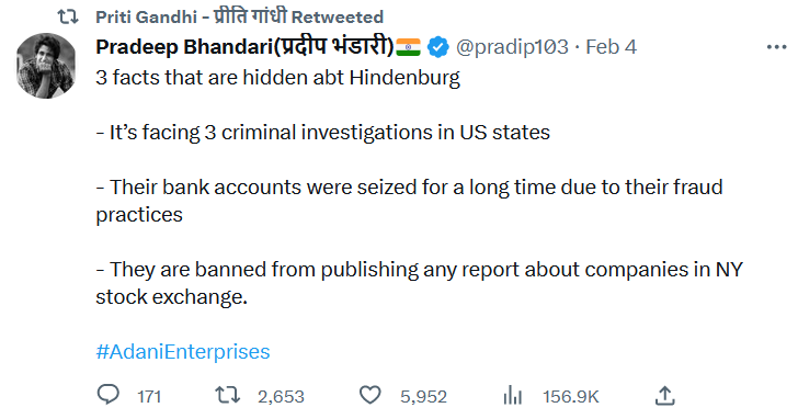Within an hour, Pradeep Bhandari, chief executive officer and founder of Jan Ki Baat posted these claims as charges against Hindenburg Research.