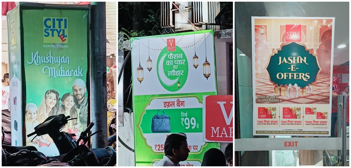 V-Mart, in their greetings encircled in a stereotypical green background accompanied by a crescent moon, wrote, ‘Fashion ka pyaar, har tyohar (The love for fashion exists during every festival).’ City Style Mall, in its greetings, used the most instrumental representation of a Muslim family – a picture of a Muslim man in a skull cap with his overdressed wife, skull-capped son and a daughter. Though the green background, the used image and its temporal relevance makes it clear for what it stands, the message on the board says, ‘Khushiyan Mubarak’.