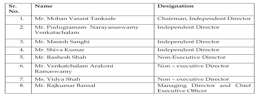 | Non-Exec, Non-indep. | Vidya Shah (finance, wife of Rashesh Shah) | |