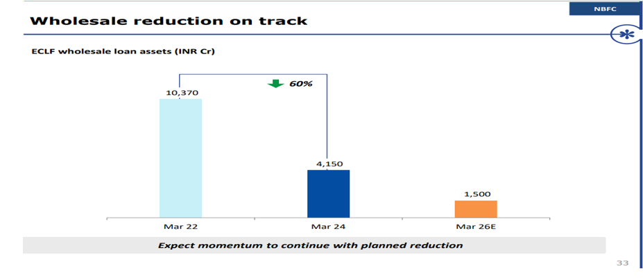 The business strictures imposed by the RBI may not be onerous for ECL, as the NBFC has been winding down its wholesale business in the last few years on account of asset quality and possible regulatory issues. In FY24, the wholesale book declined by 60% from the previous year to Rs 41.5 billion, and it was projected (even prior to the RBI censure) to reduce to Rs 15 billion in FY26.