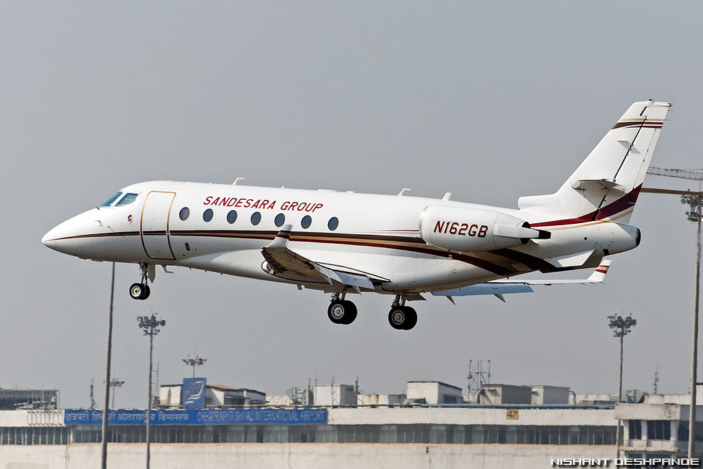 A jet comes in for landing with Sandesara Group written on the side. Photo: Nishant Deshpande