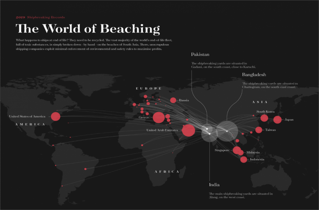 Recycling of ships is by far considered the most environmentally-friendly and economically sound way of getting rid of end-of-life ships. Until the 1970s, ships were mainly dismantled in Europe and in the US. However, due to stricter social and environmental protection laws in the Global North, the industry shifted to areas where legal frameworks and enforcement mechanisms are weak. Information consolidated by the NGO Shipbreaking Platform reveals that over the past 10 years, more than 70% of the estimated 800 vessels that reach the end of their operational life annually – representing 80-90% in terms of tonnage – are scrapped on the beaches of Alang in India, Chattogram in Bangladesh and Gadani in Pakistan.