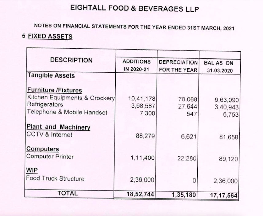 Eightall's 'notes on financial statements for the year ended March 31, 2021' include kitchen equipment, refrigerators and a 'food truck structure' among other things.